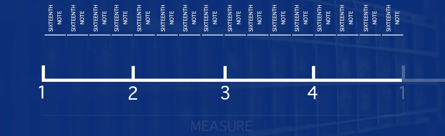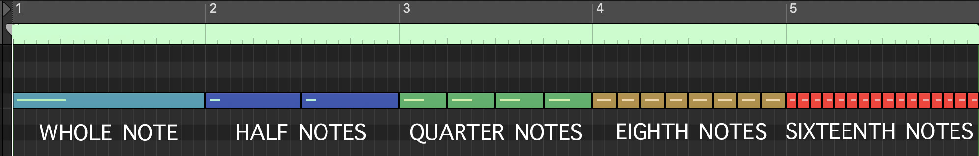 The following “Notes” refer to when and how long a specific instrument plays their notes or chords within the confines of a measure. By arranging our instruments using the following divisions of a measure we create rhythm.