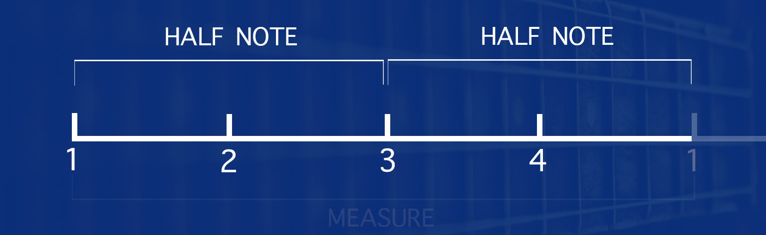 It's in the name! A half note is a whole note cut in half. If you were to play the guitar here and divide your measure up into half notes, we would only be playing two chords or musical notes throughout the measure.